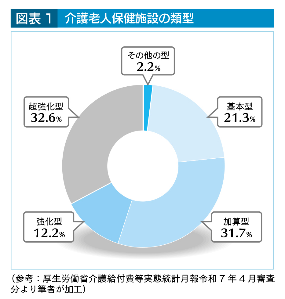 介護老人保健施設は、在宅復帰、在宅療養支援のための地域拠点となる施設およびリハビリテーションを提供する機能維持・改善の役割を担う施設として定義され、介護報酬においても在宅復帰・在宅療養等支援指標で、その機能が明確にされています。基本報酬は、超強化型、強化型、加算型、基本型、その他型に分類され、近年、上位類型の割合が増加傾向にあります(図表1)。特別養護老人ホームと同様に長期療養だけを目指すと在宅復帰・在宅療養等支援指標が低くなり、在宅復帰を試行すると稼働率が低迷し、結果として収益低下を招くことにつながります。在宅復帰と在宅療養支援の両方の機能を保持するバランスが求められています。