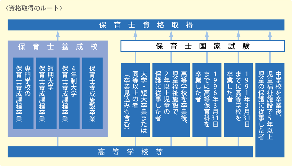 資格取得のルートは、厚生労働省が指定した保育士養成課程のある学校を卒業する方法、および都道府県が実施する保育士資格取得試験に合格する方法の2つがありますが、一般的には保育士養成校に進学、必要な単位を取得して、卒業して取得するのが最も早道です。