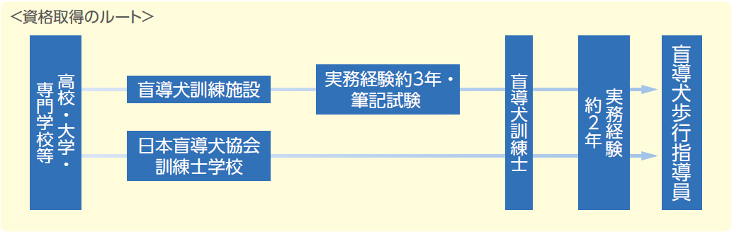 主に2つのルートがあります。1つは国家公安委員会に盲導犬訓練施設として指定された法人に勤め、研修を約3年受けて認定を受けるルートです。