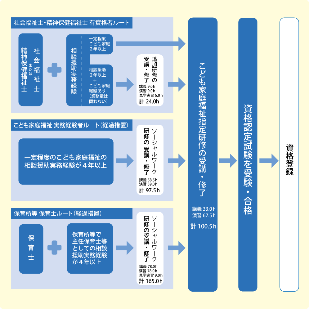 こども家庭福祉指定研修(100.5時間)を受講・修了したうえで、資格認定試験を受験・合格し、資格登録することで、こども家庭ソーシャルワーカーを取得できる