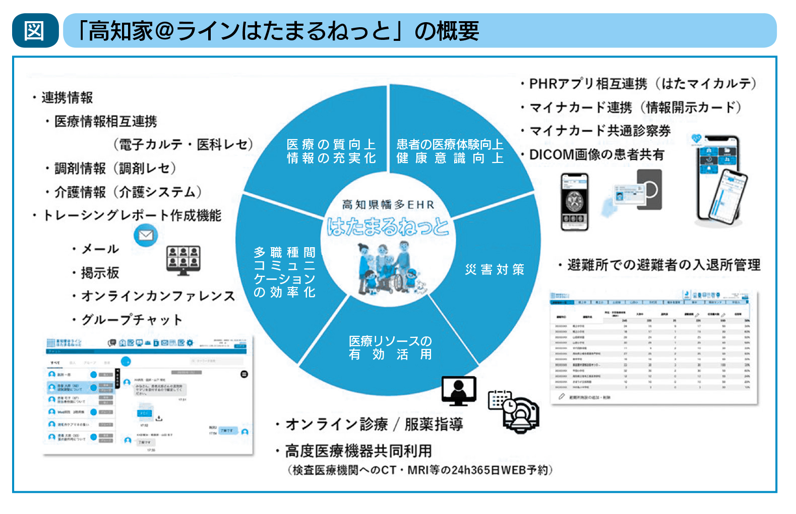なお、令和元年5月から高知県下で稼働していた医療介護情報連携システム「高知家ケ@アライン」と統合し、「高知家@ラインはたまるねっと」として、高知中央医療圏を除いた県内全域での医療・介護情報ネットワークを構築している。「高知家@ラインはたまるねっと」の活用により、診療情報に加え、介護や在宅医療に関する情報共有もスムーズに行えるようになっているという。