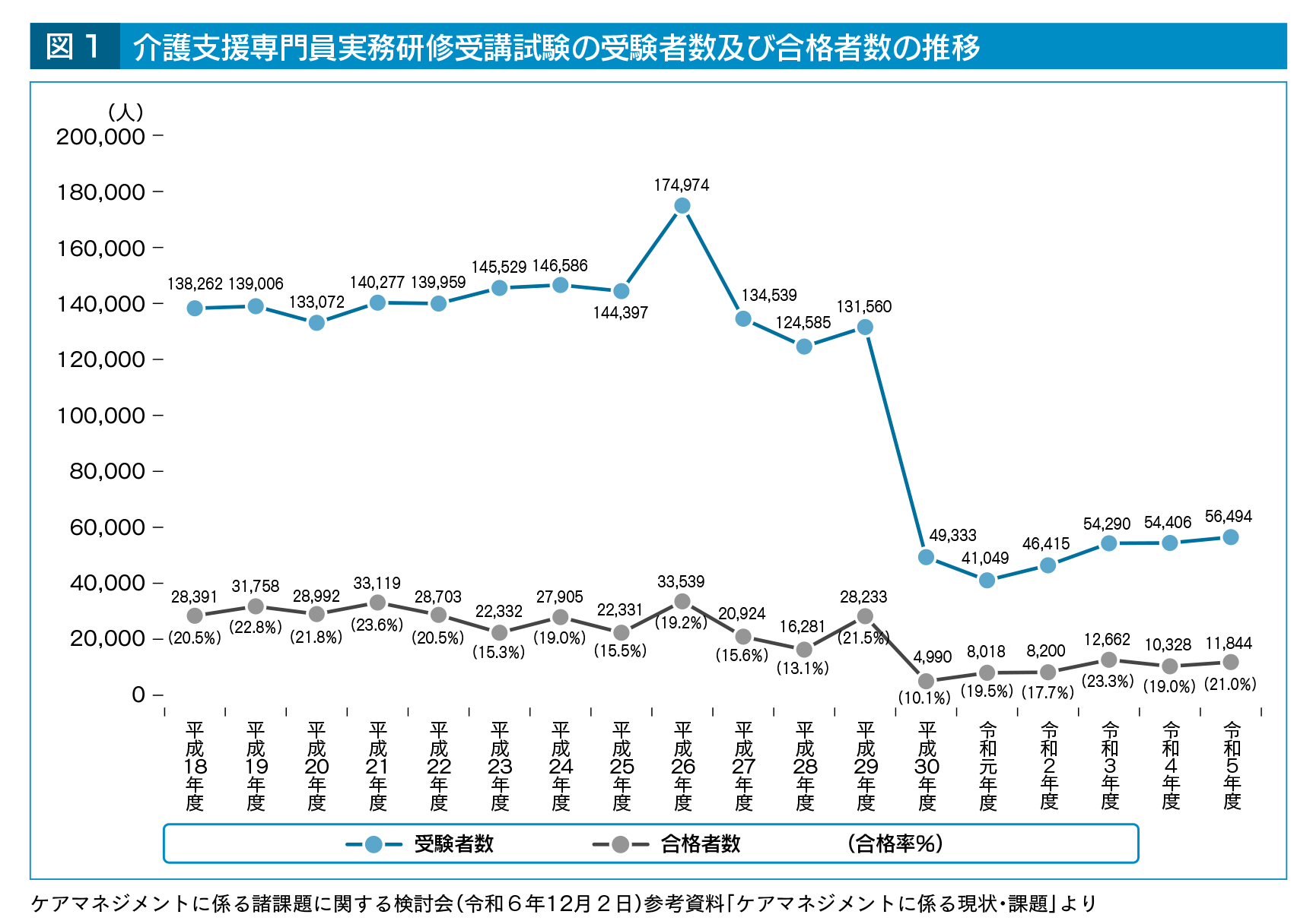 一方、生産年齢人口の急速な減少が見込まれることに加え、ケアマネジャーの従事者数(約18.3万人前後)は横ばい・減少傾向にあり、さらに介護支援専門員実務研修受講試験の受験者数は近年5万人前後で推移し、合格者数も2018(平成30)年以降、継続して2万人を下回る状況にある(図1)。