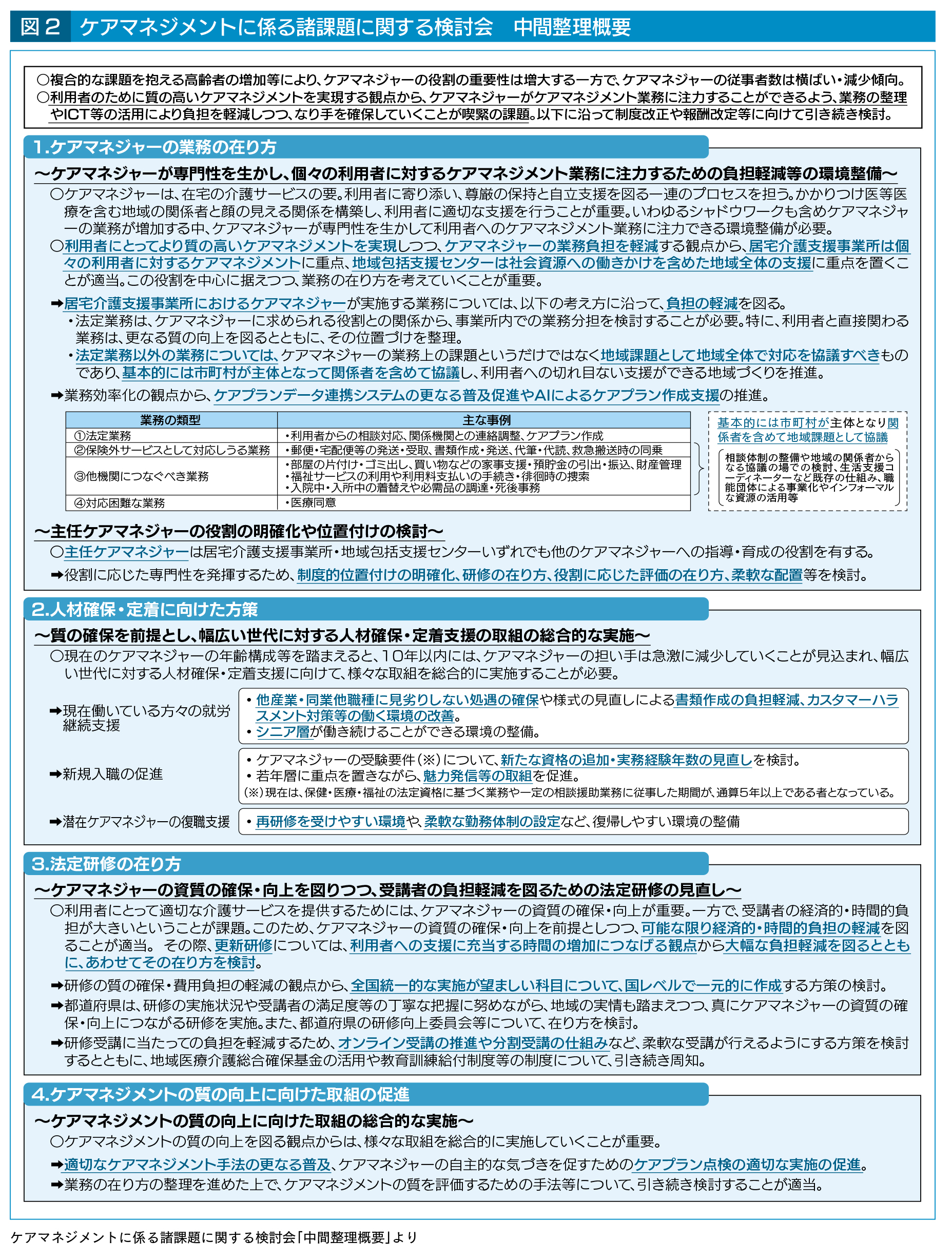 厚生労働省では、ケアマネジメントの質の向上及び人材確保に向けた制度的・実務的な論点について包括的に検討を行うため、2024(令和6)年4月から「ケアマネジメントに係る諸課題に関する検討会」で議論を開始し、同年12月12日に中間整理をとりまとめた。
