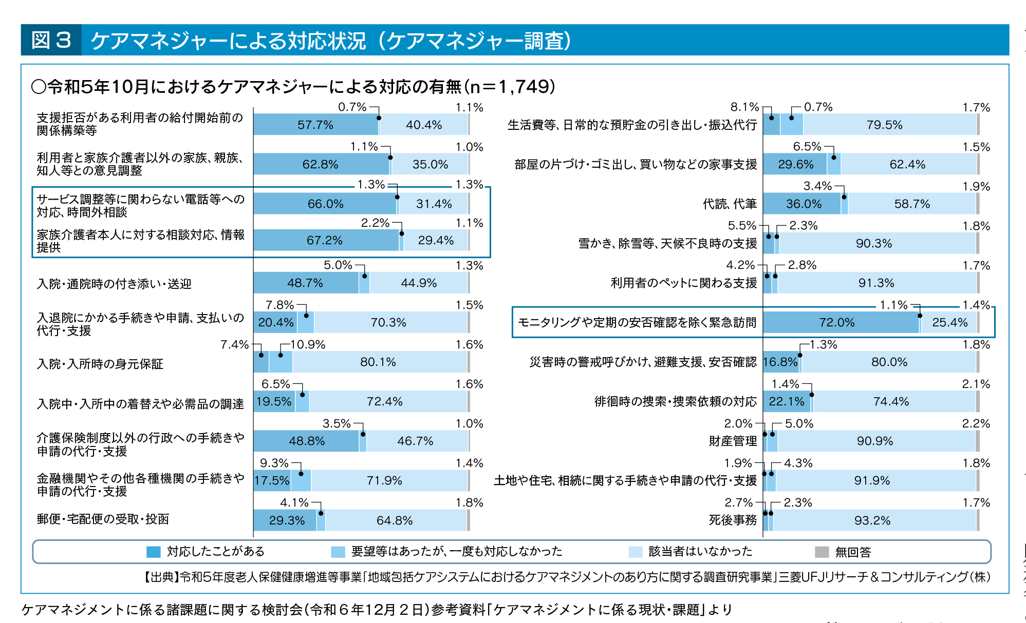 なお、シャドウワークへのケアマネジャーによる対応状況については、「モニタリングや定期の安否確認を除く緊急訪問」が最も多く、次いで「家族介護者本人に対する相談対応」、「サービス調整等に関わらない電話等への対応、時間外相談」が多くなっている(図3)。