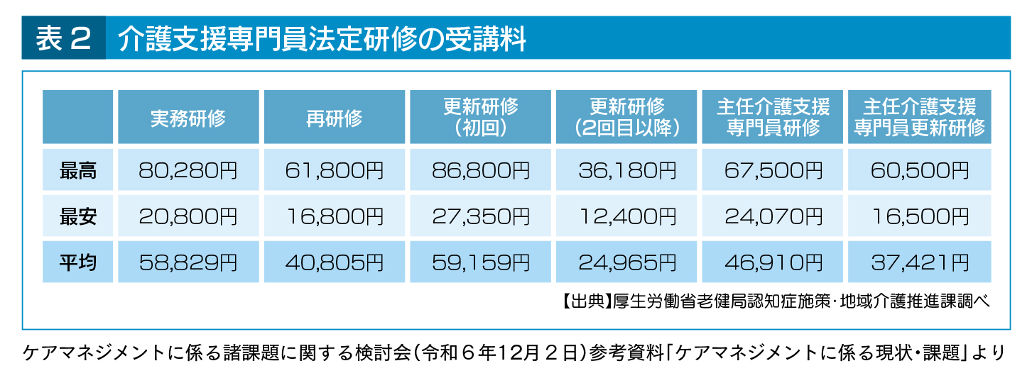 Bの法定研修のあり方については、ケアマネジャーの質の確保・向上が重要である一方、受講者の経済的・時間的負担が大きいことが課題となっている(表1、2参照)。このため、ケアマネジャーの資質の確保・向上を前提としつつ、可能な限り経済的・時間的負担の軽減を図ることが適当であり、その際、更新研修については、利用者への支援に充当する時間の増加につなげる観点から大幅な負担軽減を図るとともに、あわせてそのあり方を検討する、としている。