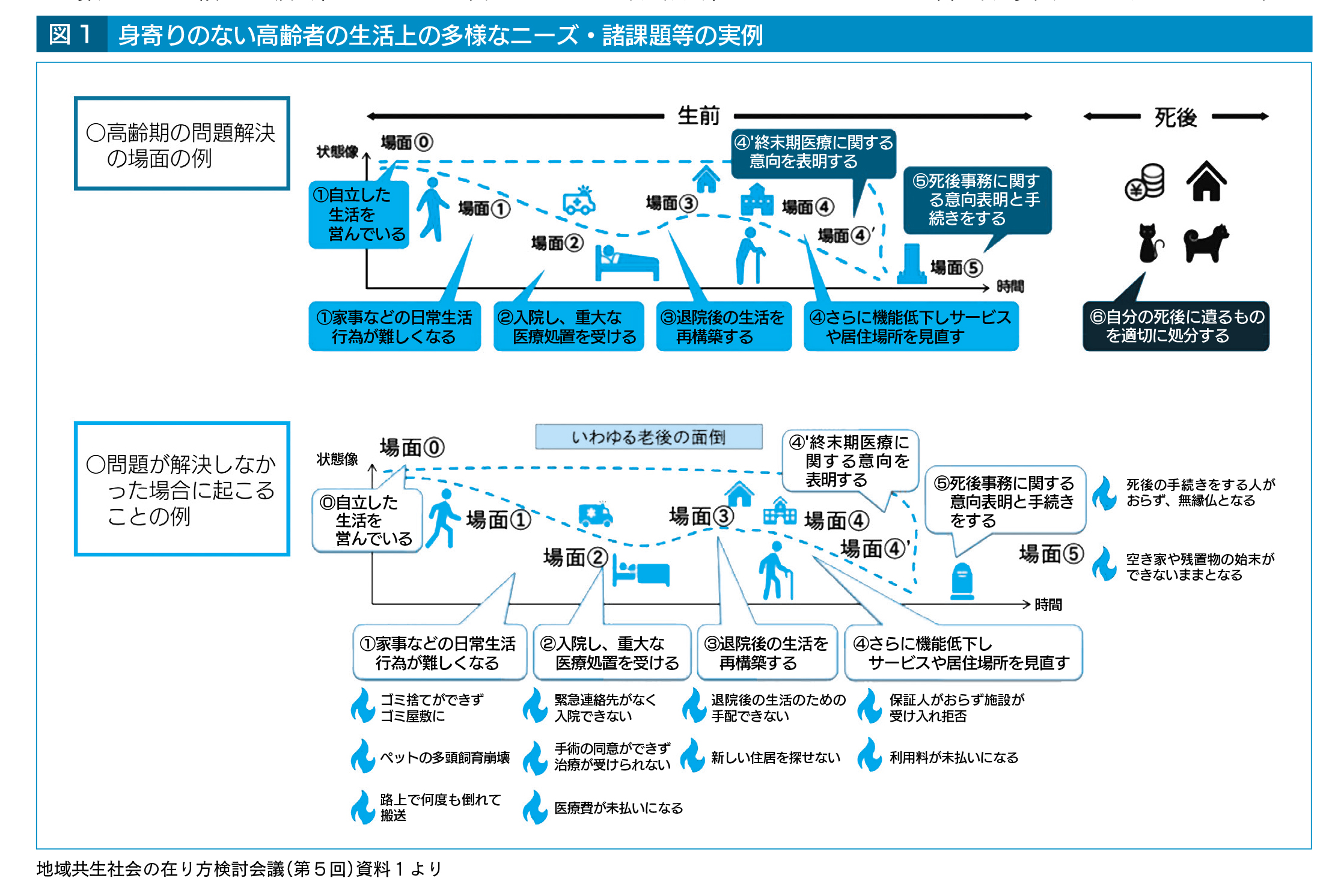 頼れる身寄りがいないことにより抱える生活上の課題(図1参照)への具体的な対応として、いわゆる「高齢者等終身サポート事業」は対応策の一つであるが、費用が高額になることもあり、一定程度の収入・資産がなければ利用が困難等の課題があるため、資力が十分にない人も利用できる事業が求められている。また、そうした事業は、資力の有無にかかわらず利用できるようにするべき、との指摘もある。