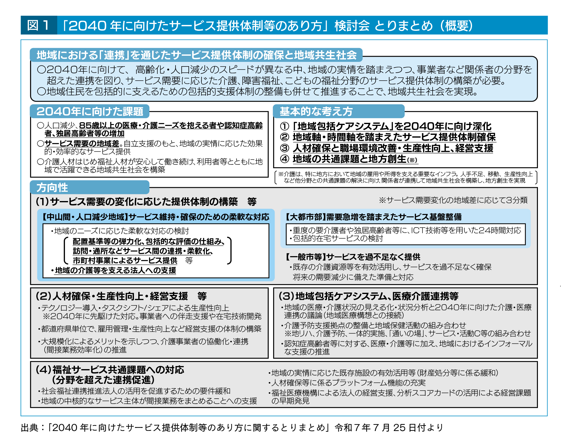 2025年1月から議論を開始した「2040年に向けたサービス提供体制等のあり方」検討会は7月25日、@サービス需要の変化に応じた提供体制の構築(中山間・人口減少地域の配置基準の弾力化等)、A人材確保・生産性向上・経営支援等、B地域包括システム、医療介護連携等、C福祉サービス共通課題への対応(分野を超えた連携促進)等を内容とするとりまとめを公表しました。その内容をみていきます。