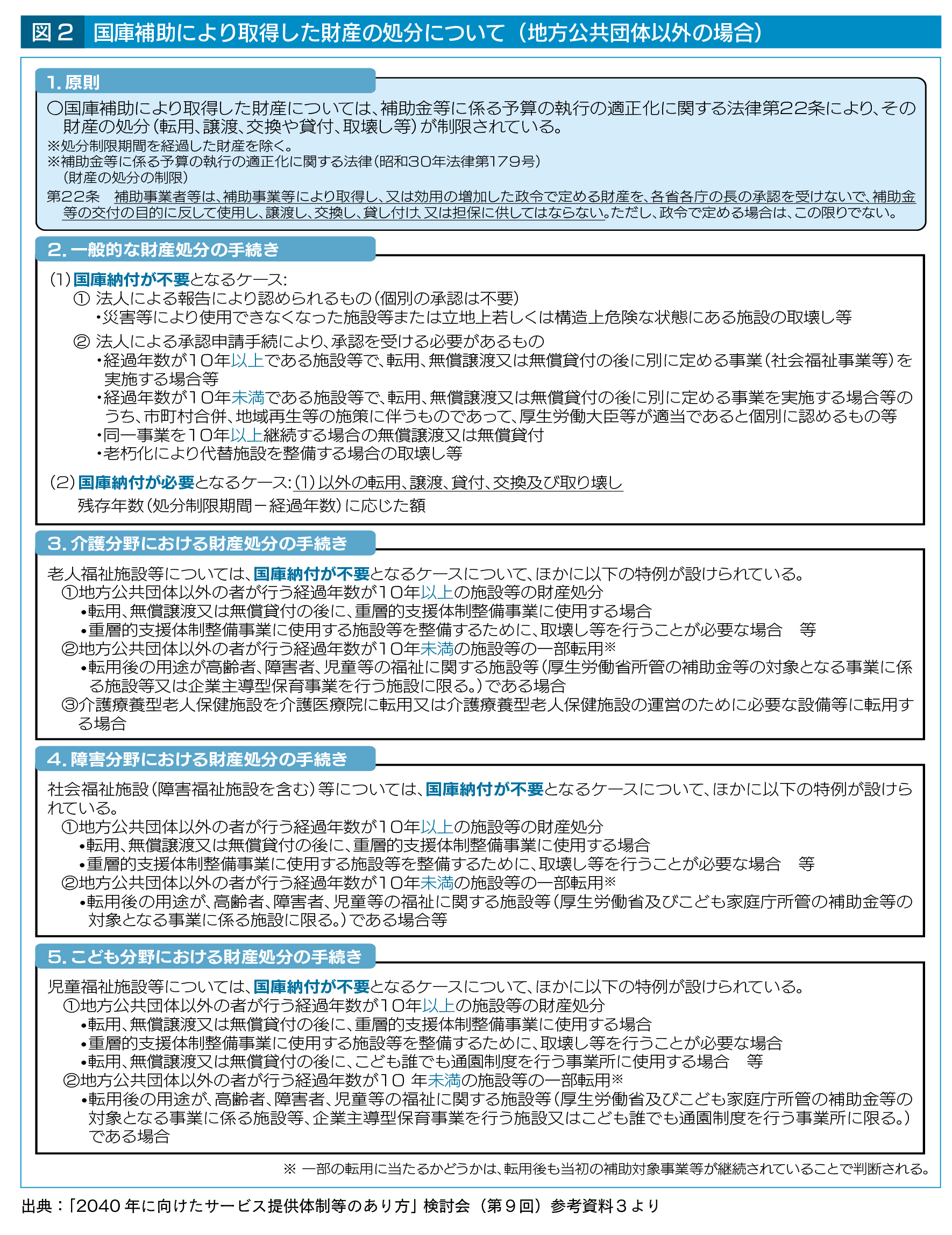 サービス需要が減少するなか、施設等の整備については、今後その機能を柔軟に変更していく必要がある。介護保険施設の一部で障害福祉サービス、保育等を行う場合に、元々の補助金の目的範囲外での返還を求められることのないよう、経過年数10年未満の施設等の全部転用の緩和等を行うなど、柔軟な制度的な枠組みの検討が必要、と指摘している。