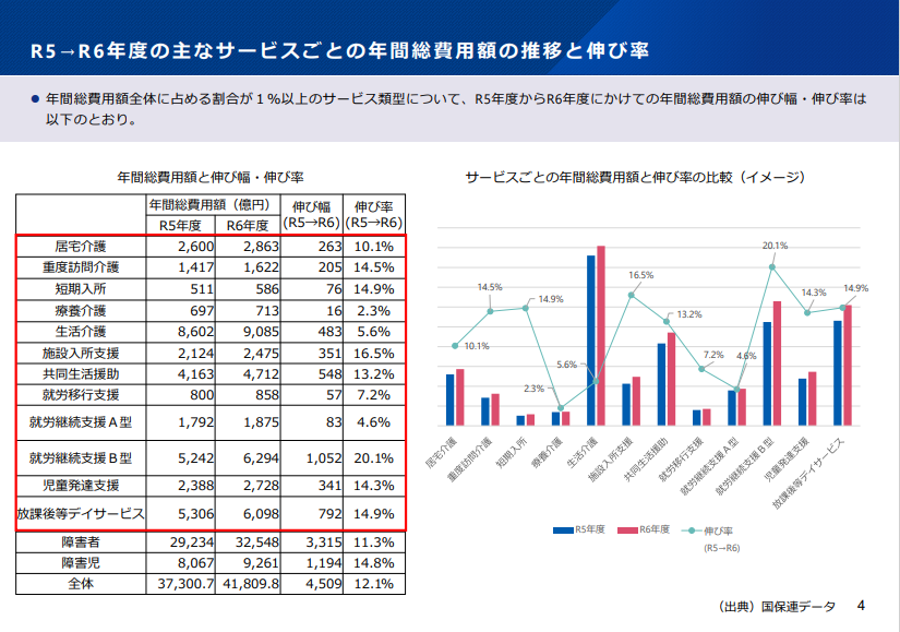 サービス種別ごとの分析では、額の伸び幅で大きなものとして、「就労継続支援B型」(+1,052億円)、「放課後等デイサービス」(+792億円)、「共同生活援助」(+548億円)があり、伸び率で大きなものとしては「就労継続支援B型」(20.1%)、「施設入所支援」(16.5%)などが該当するとしている。