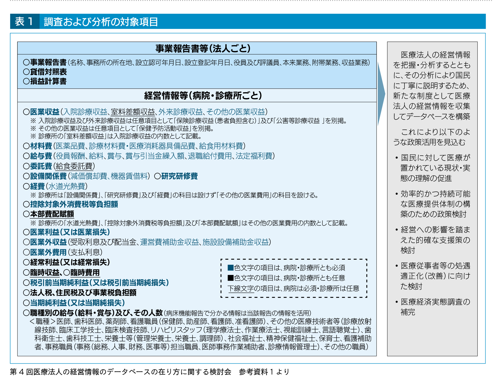 @、Aについては、すでに2023(令和5)年8月1日から施行されており、すべての医療法人が毎会計年度終了後に経営情報を都道府県知事に報告、医療法人の経営情報データベース(MCDB*1)に情報が蓄積され、政策への反映等が行われている(図参照)。収集する情報は、病院・診療所における収益、費用のほか、任意項目として職種別の給与(給料・賞与)・人数となっている(表1参照)。これらのデータは、すでに中央社会保険医療協議会(中医協)、社会保障審議会医療部会等の議論で活用されている。また、昨年度からは自治体からIDが配布され、オンラインで登録できる仕組みが構築されるなど、報告の利便性は高まっている。