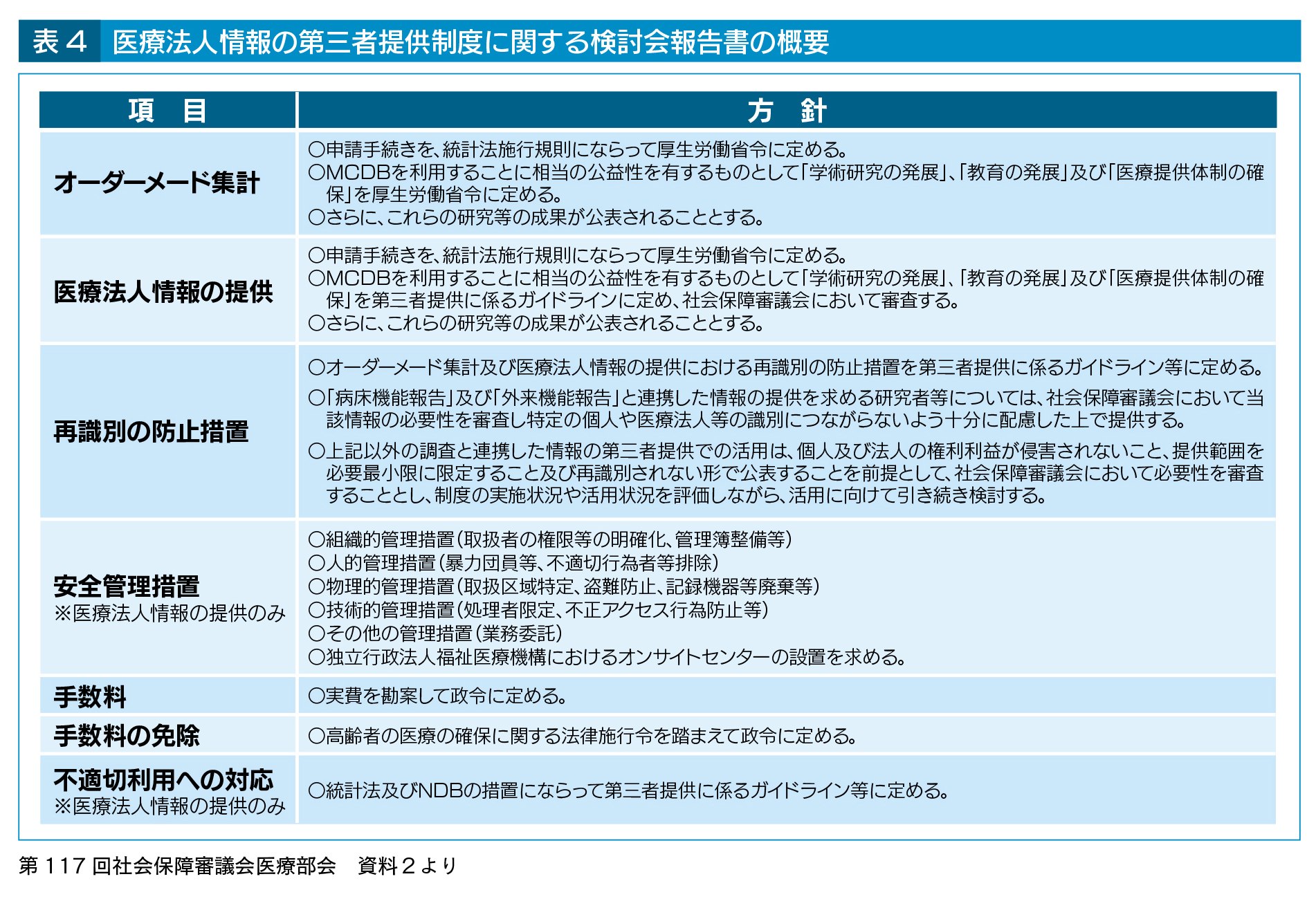 を定めることを求めている(表4参照)。さらに、不適切利用を把握する方法(苦情相談窓口の設置等)や不適切利用が生じた場合の対応・措置についても、統計法とNDB(匿名医療保険等関連情報データベース)の措置にならい、第三者提供に係るガイドライン等に定めることを求めている。