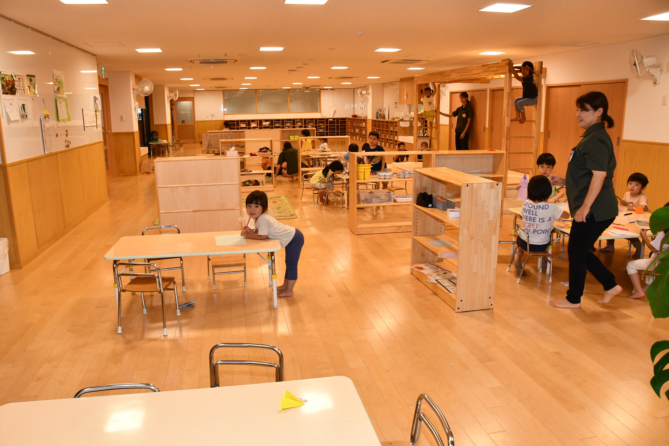 園内の設計では、玄関や職員室、給食室、休憩室、トイレなどはすべて共用とすることで、利便性を高めるとともに建築コストの大幅な削減につながっている。また、1階に2〜5歳児室と発達支援室、2階に1歳児室と一時預かり、発達支援室を設けているが、1階にある各年齢の保育室と発達支援室は壁をすべて取り除くことで、同じ空間のなかで健常児と障害児等が一緒になり、過ごす場所や遊ぶ相手、活動内容を自分たちで選択して過ごしているという。
