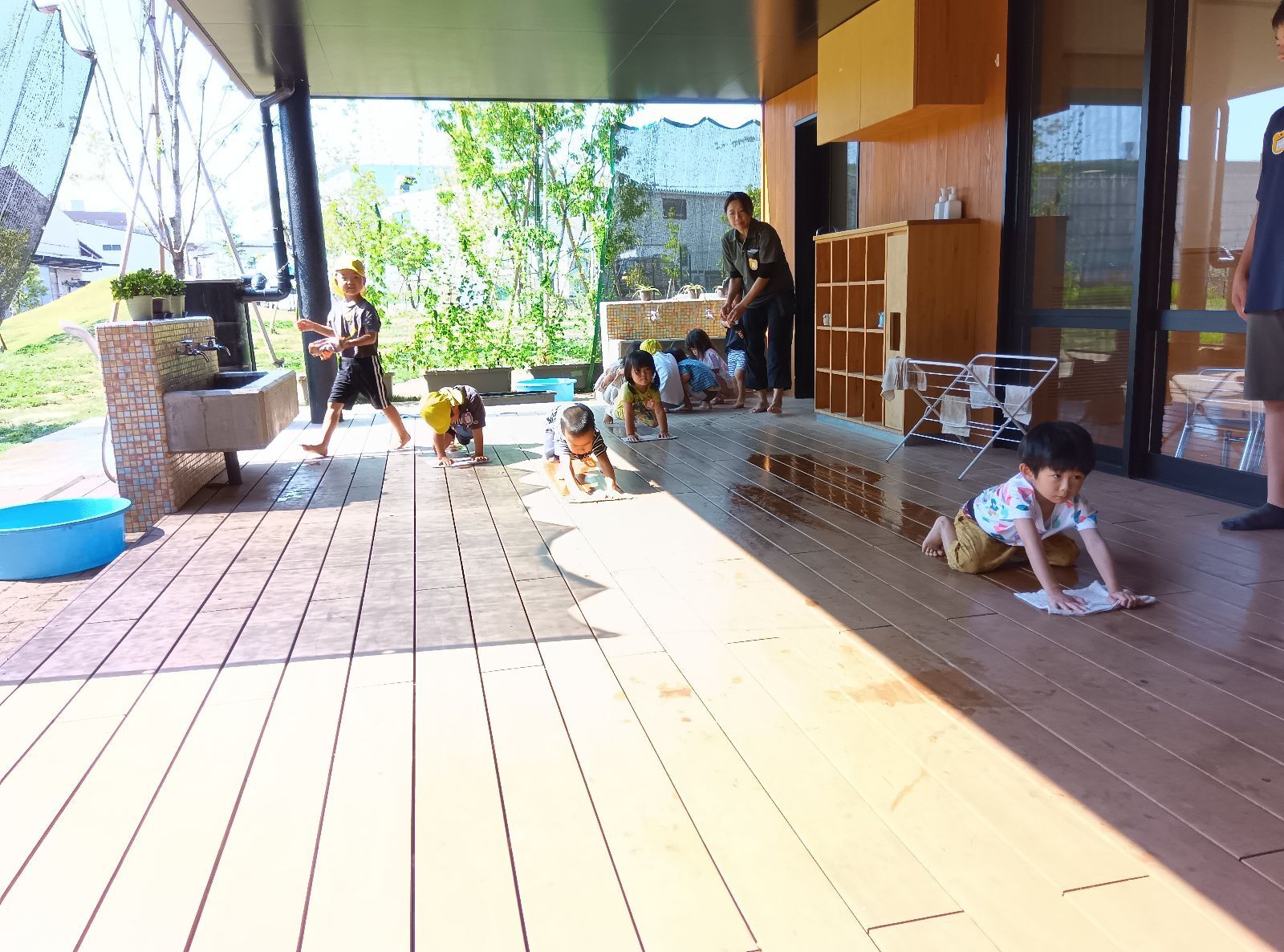 また、園外ですれ違ったすべての人と挨拶を交わすことを園の約束とし、地域の公園に出向いて地域の親子と交流する青空保育や商店街ツアー、銭湯でお風呂の日などの地域の交流活動を通して「感じたこと・考えたこと」を言葉で表現できるこどもを育成することを目指している。