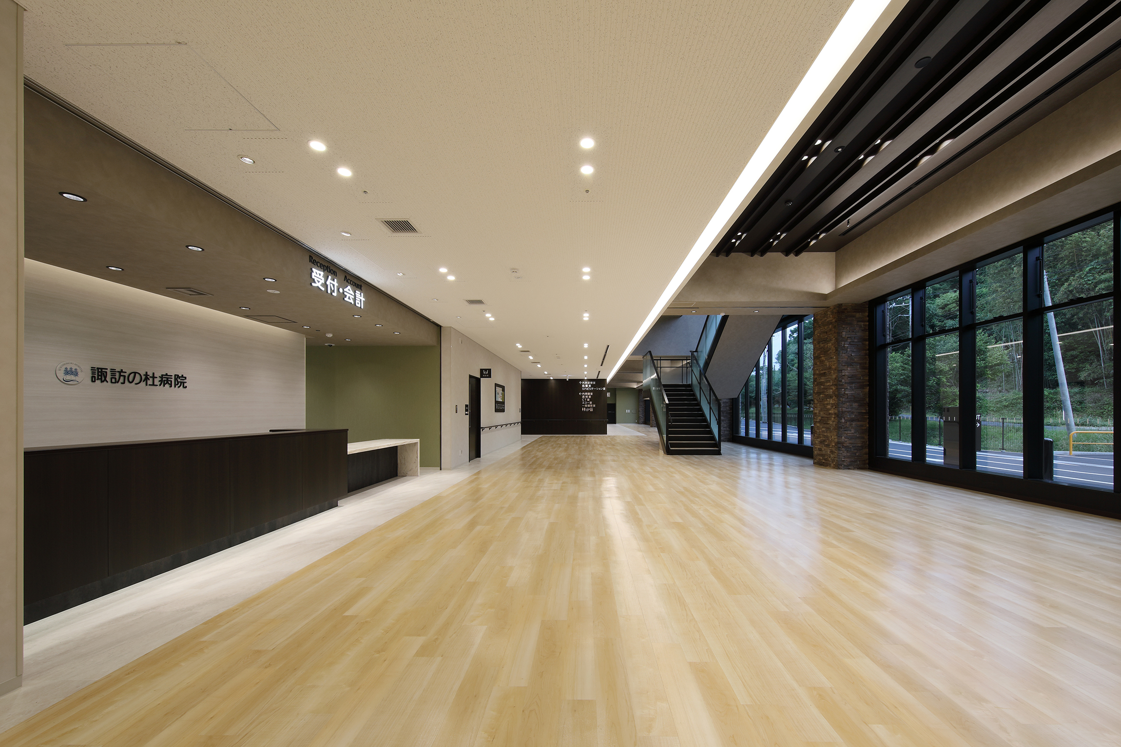 | ▲ 令和6年10月に移転新築した諏訪の杜病院の総合受付 | ▲ 回復期リハビリテーション病棟の多床室。病室は広い設計にすることで快適な入院環境を提供 |